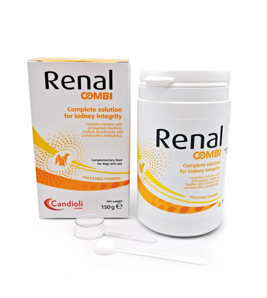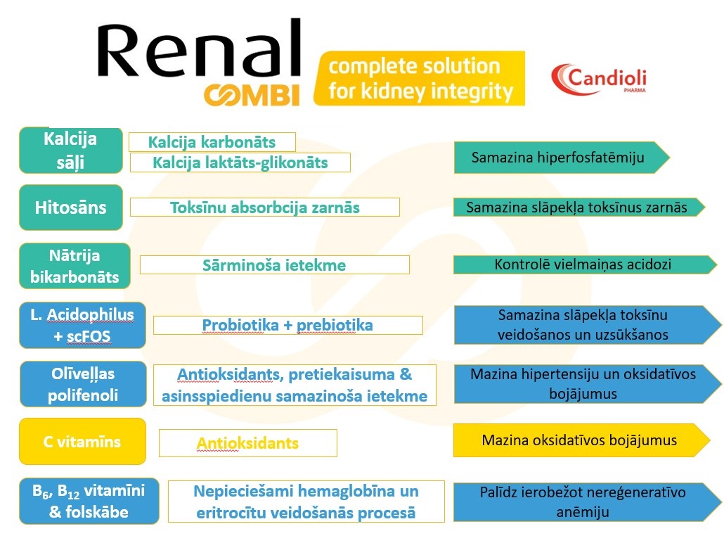 Renal COMBI nodrošina nepieciešamo kalcija karbonātu, kalcija laktāta glikonātu, hitozānu, nātrija bikarbonātu, lai kontrolētu hiperfosfatēmiju un metabolisko acidozi.