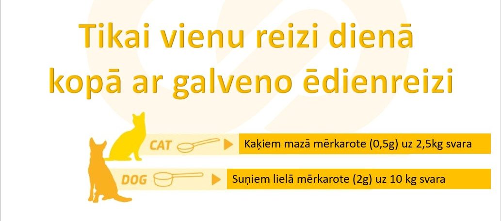 Pieaugušiem suņiem un kaķiem – 0.2g pulvera uz 1 kg ķermeņa svara 1x dienā.