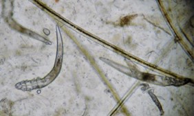 Lai konstatētu demodeks ērces mikroskopā veterinārārsts ņem dziļus ādas nokasījumus – līdz parādās asinis (attēlā – demodeks ērces un mati); mikroskopā var redzēt ne tikai ērces, bet arī baktērijas. Var veikt arī polimerāzes ķēdes reakciju.